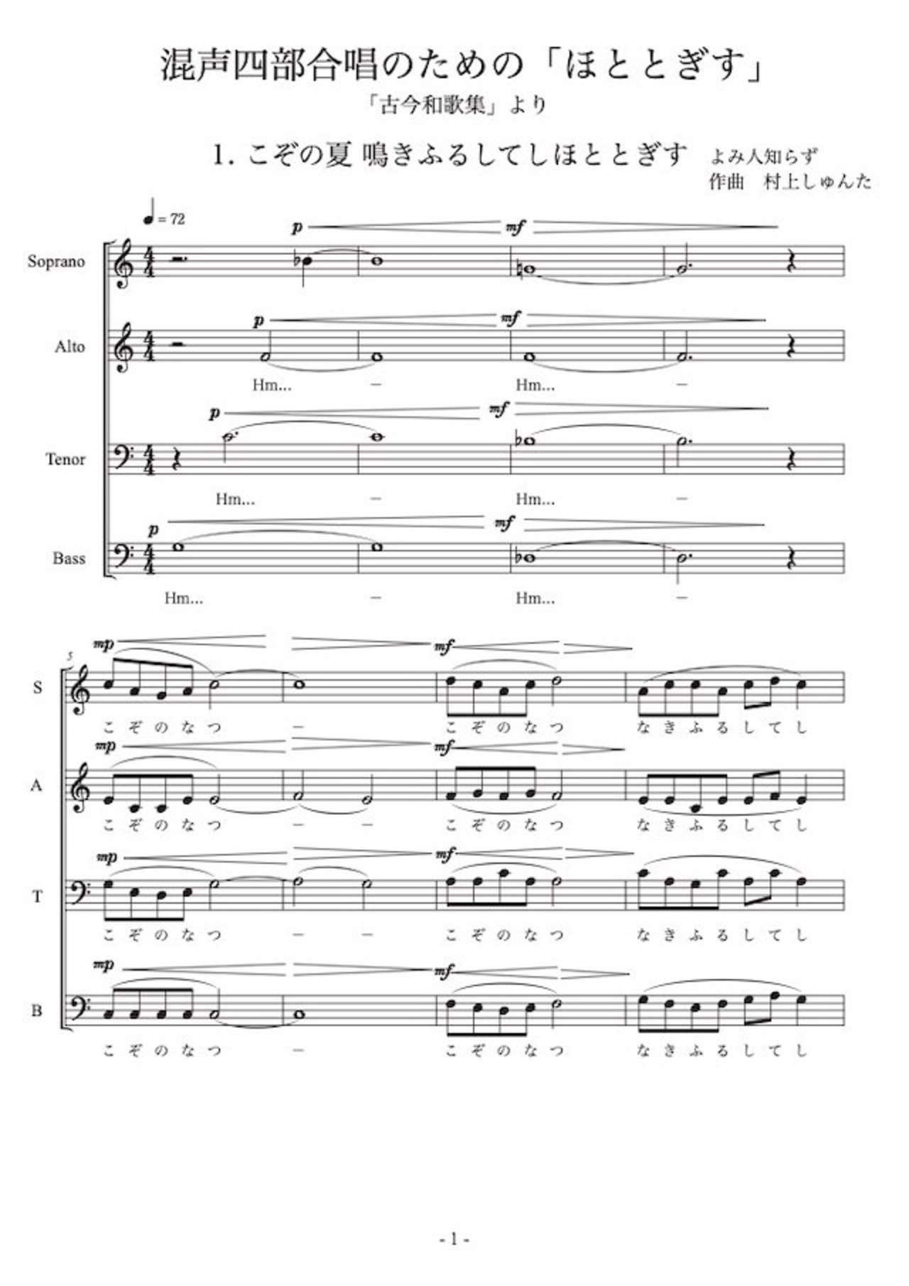 混声四部合唱のための「ほととぎす」”古今和歌集”より 1.こぞの夏 鳴きふるしてしほととぎす